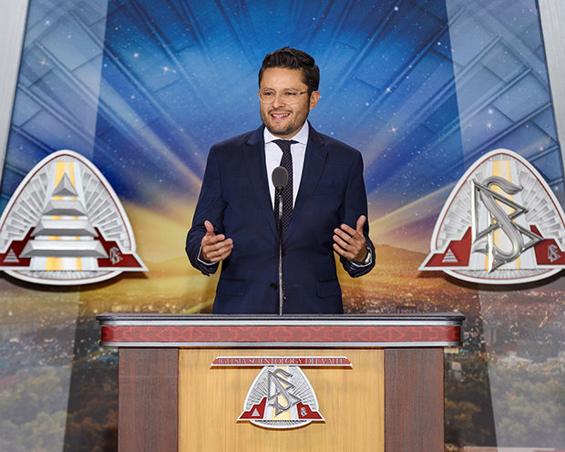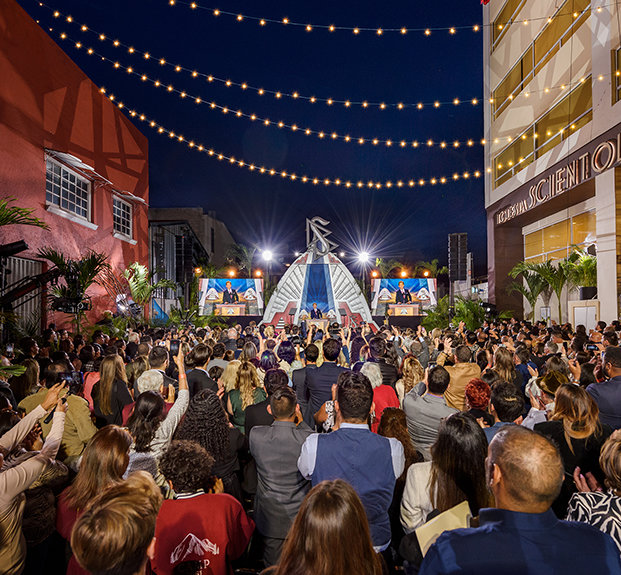 Esa enfática bienvenida llegó con autoridad cuando el Sr. David Miscavige, líder eclesiástico de la religión de Scientology, subió al escenario para abordar a todos los presentes. “Recuerden, la esencia misma y la fuerza de vida de una Org Ideal es, como nuestro Fundador envisionó: ‘Un grupo al que la gente vendría para lograr libertad y en el que tendrían confianza de que la lograrían’. Y eso es lo que celebramos hoy. Es el regalo que están dando. Y la visión hecha realidad por ustedes, los héroes de este movimiento, en la creación de esta Org Ideal”, dijo el Sr. Miscavige. “¿Quieren presenciar cómo se hace la historia en esta megaciudad latinoamericana? Pues el momento ha llegado, justo aquí y justo ahora”.
