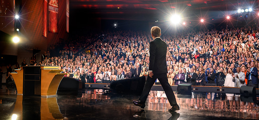 La primera de innumerables ovaciones de pie saluda al Sr. Miscavige mientras Scientologists de más de 70 naciones llenan el auditorio por completo para celebrar el 75 Aniversario de Dianetics, el best seller de todos los tiempos sobre la mente humana.