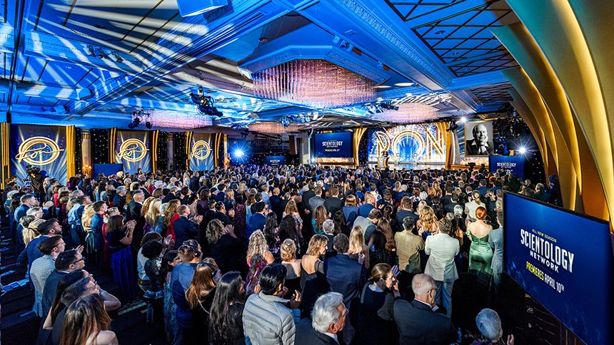 La atmósfera estaba rebosante de anticipación y cuando el Sr. David Miscavige, líder eclesiástico de la religión de Scientology, entró, la multitud se puso de pies dándole la bienvenida con una ensordecedora ovación que siguió… siguió… y siguió.