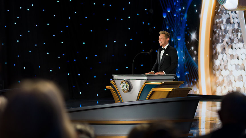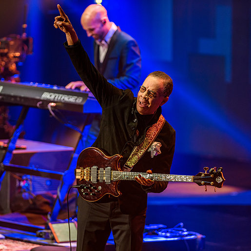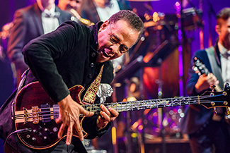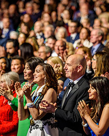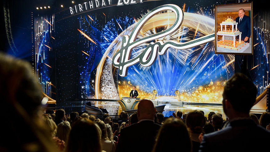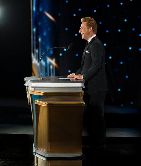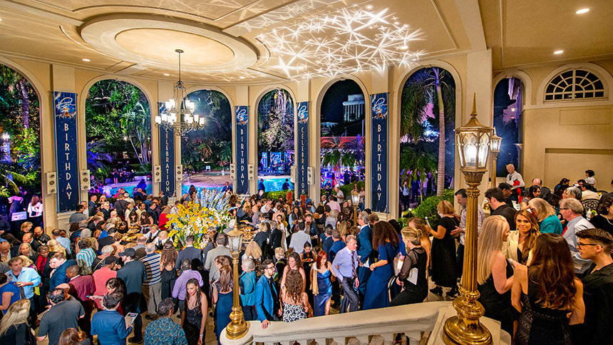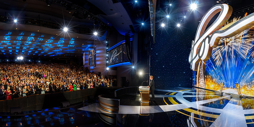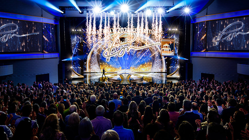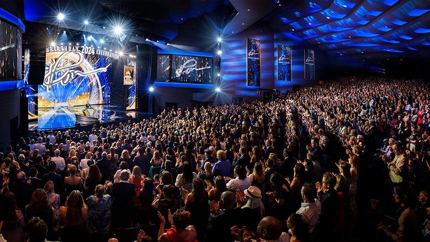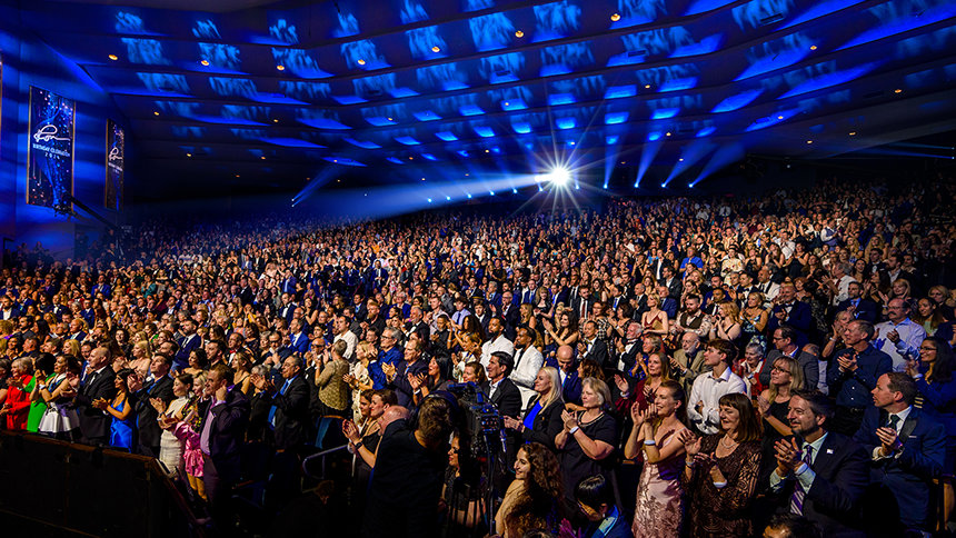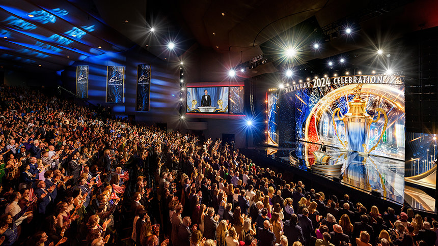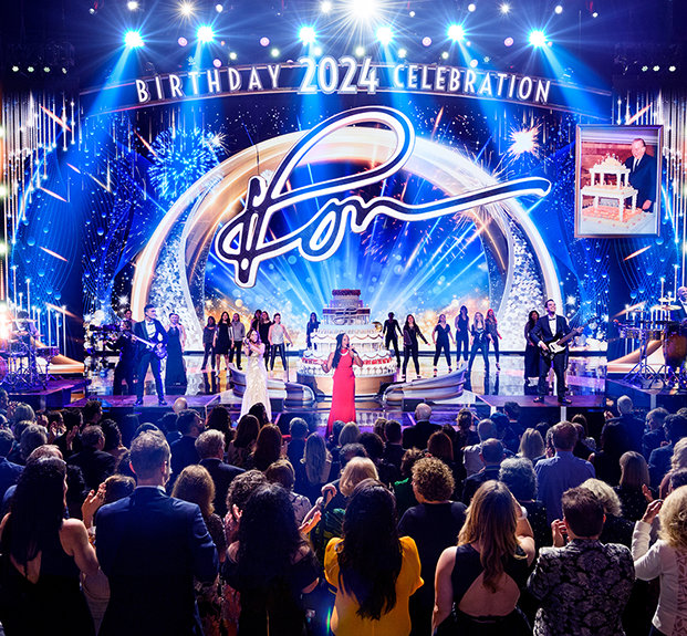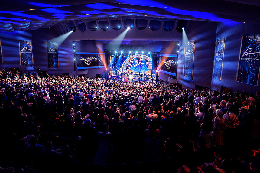 Después de una actuación de 30 minutos llena de energía por una banda superlativa —unida por solistas, bailarines e incluso el bajista ganador del Premio Grammy Stanley Clarke—, fuegos artificiales y la primera de docenas de ovaciones de pie le dieron la bienvenida al Sr. David Miscavige, Presidente de la Junta del Religious Technology Center, mientras subía al escenario para celebrar el cumpleaños de L. Ronald Hubbard (LRH).