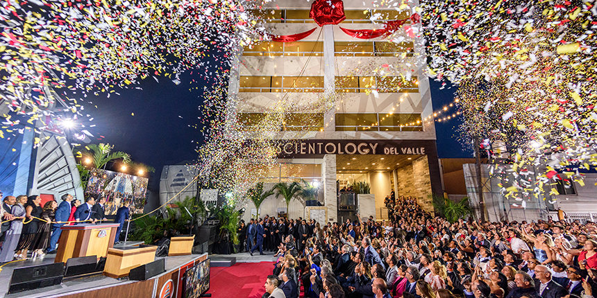 Solo seis días después, el Sr. Miscavige viajó 1600 kilómetros al sur hasta la Ciudad de México, la ciudad de habla hispana más grande en la Tierra, donde los mariachis le cantaron serenatas a los que estaban reunidos. Bajo un cielo nocturno, el Sr. Miscavige conmemoró la Gran Apertura de la Org Ideal de Del Valle. El edificio de 12 pisos, con su letrero de Scientology iluminado de más de 24 metros, se eleva por encima de la ciudad y se puede ver desde un kilómetro y medio en todas direcciones.
