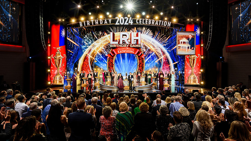 “Como es apropiado en esta noche de noches, presentaremos lo que LRH más deseaba en su cumpleaños: no solo un Juego de Cumpleaños que significa EXPANSIÓN”, le dijo el Sr. Miscavige a la multitud al comienzo de las festividades del sábado por la noche, “sino también el destino expansionista impulsado por su Tecnología y todo como se manifiesta en las Orgs Ideales.