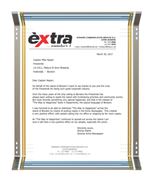 La interacción del Freewinds y de su tripulación con la sociedad muestra “que no se trata solo de extender una mano, o conceder un favor, sino de una responsabilidad social”, dijo el Ministro sobre la Infraestructura y Puertos de Santa Lucía, en un video tributo. “Esa pasión es una de amor, de sinceridad, y de verdadera amistad y felicidad”.