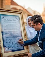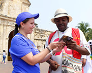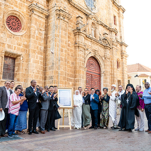 Después de un discurso de bienvenida de la Directora de Asuntos Religiosos de Colombia, los asistentes se tomaron de manos para orar y poco después caminaron juntos desde el barco al Casco Antiguo de la ciudad de Cartagena a la Plaza de San Pedro Claver para la firma de una histórica declaración interreligiosa de paz.